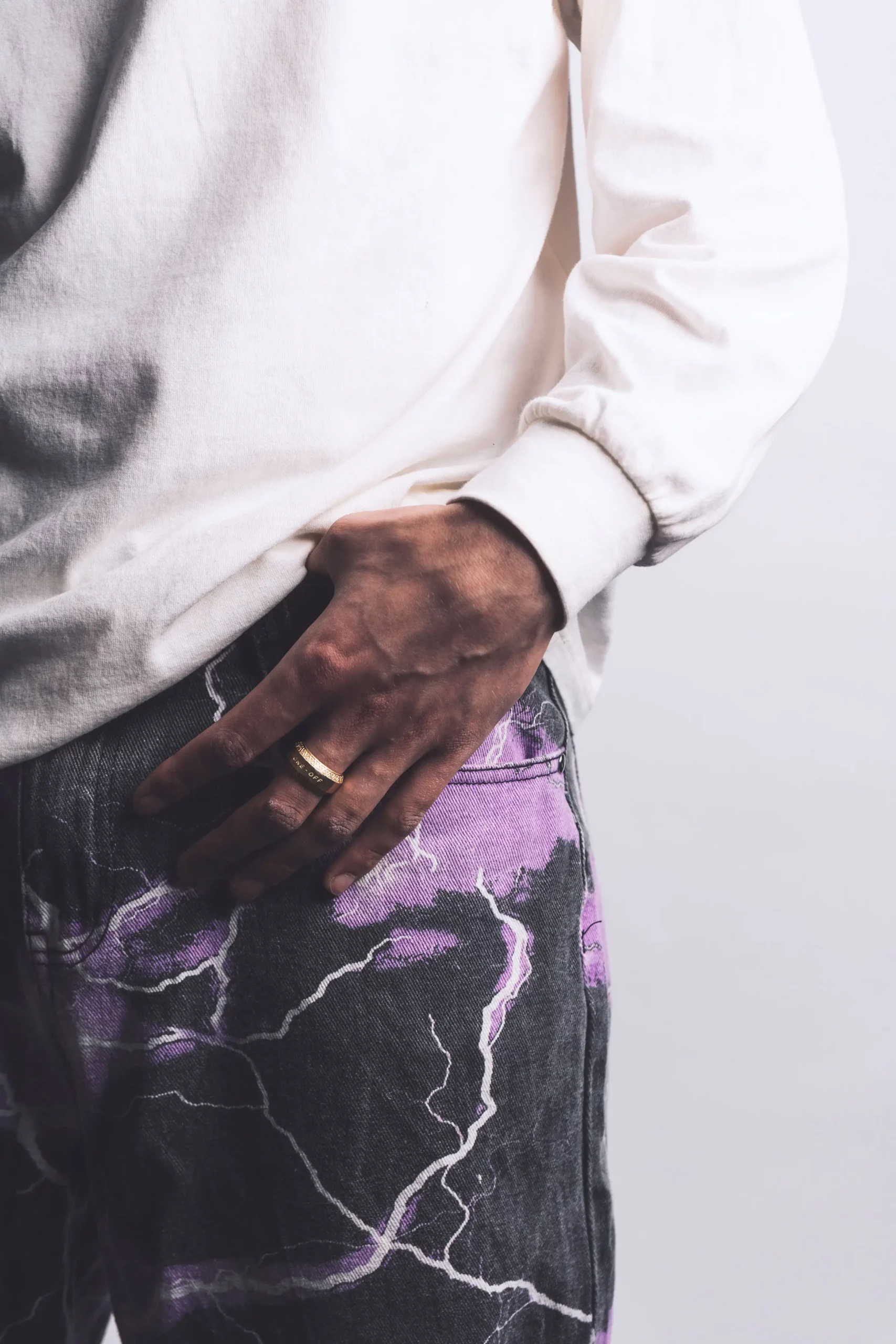 Massive ring including a carved sculpture in the front and the word ‘One-Off’ engraved on the back. The upper and lower band include a triangular pattern and the inner band of the ring features our jewelry stamp.